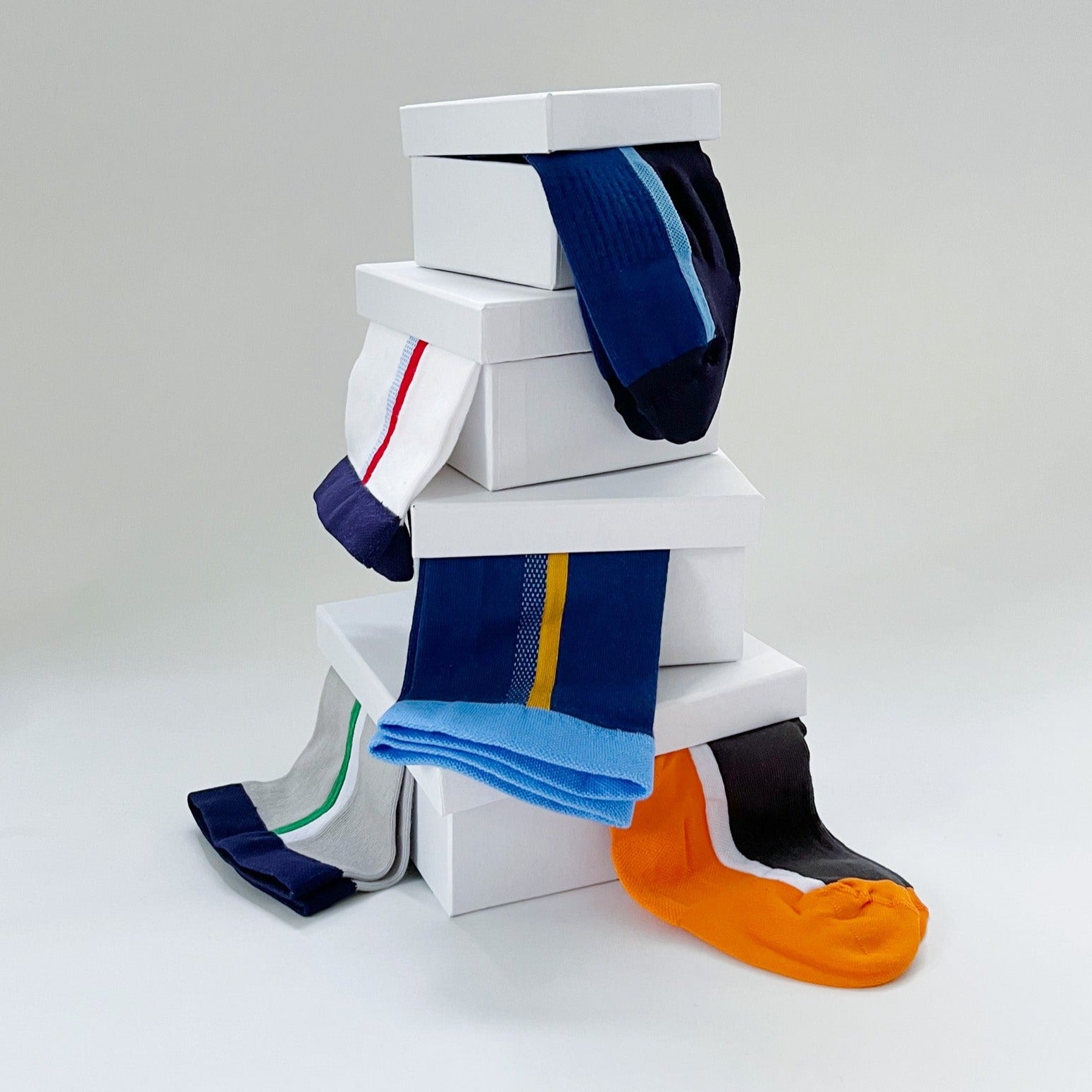 A stack of white boxes with various colorful socks draped over them, including blue, orange, black, gray, and white socks with different patterns and stripes, set against a plain light background.